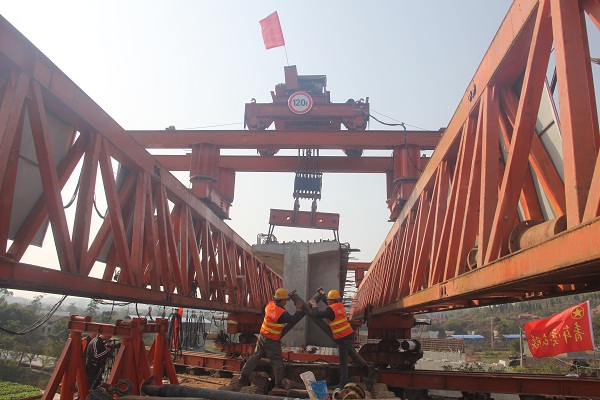 ?? 中铁二十二局四公司技术人员在潼大荣龙岗中桥T片桥梁安装中科学组织安装图。蒋文友 摄影 “再向前来15公分,往左移动1公分……好!”1月8日上午9时06分,随着现场施工作业人员的指令,潼大荣高速公路龙岗中桥首片T梁架设成功,标志着该路段由线下施工进入桥梁上部结构物施工。 潼大荣高速公路是重庆首个全国绿色公路建设典型示范工程项目,起于潼南宝龙镇,与四川境内路段顺接,经龙形镇,跨涪江与渝遂高速形成枢纽互通,跨琼江后与成渝复线相交设枢纽互通,经大足三驱镇,荣昌月光村、清升镇至清江镇终点,顺接四川段路线。作为重庆市高速公路网规划中的七联线,项目路线全长139.112公里。全线设置互通式立交12处,服务区3处,停车区1处,桥梁60座,隧道5座。其中大足段长约28公里,途经中敖、龙岗、三驱、龙石4个镇街,设有龙岗互通、石篆山互通,三驱枢纽互通及龙岗服务区,主线设置通道、涵洞共90座,天桥7座,分离式立交桥1座,征地约3000亩。2019年建成通车后,将完善西部交通网络,对地区开放合作具有重要意义。 该项目负责人介绍,为保证此次首片T梁成功架设,项目负责人及技术人员盯守一线,科学组织施工,严管质量安全,抢抓当前有利天气条件,专门指定现场负责人1名,安全管理人员3名,其中专职安全员1名,特种作业人员3名,技术工人6名,并成立了质量管理领导小组,安全管控领导小组,应急领导小组,确保T梁架设安全质量无事故。 当前,在转洞隧道于2017年率先成功双线贯通基础上,加速推进路基工程,交安、消防、通信管道等工程同步配合施工,各项工作正按照建设目标稳步推进。(蒋文友)
