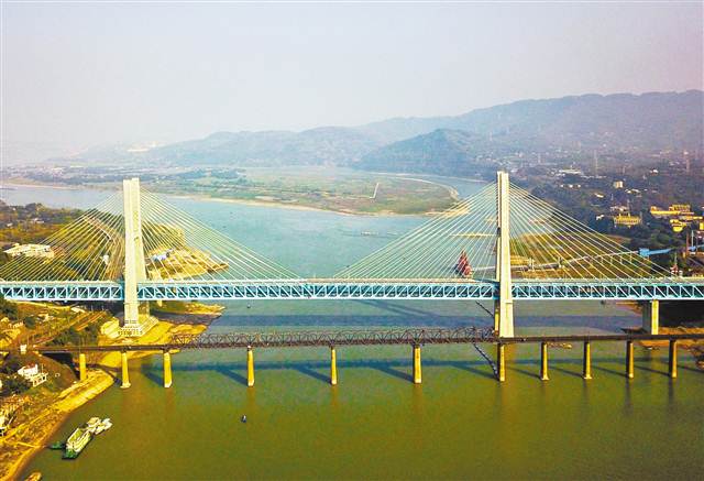 一列动车从渝贵铁路上驶过(1月11日摄)。新华社记者 欧东衢 摄 近日,渝贵铁路进入联调联试冲刺阶段,离正式开通投用又近一步。渝贵铁路的建成,将成为西南地区连接西北、华南、华东的“快车道”,川渝黔地区与沿海城市的时空距离也将大幅缩短。 值得一提的是,渝贵铁路世界首座双层六线钢桁梁铁路斜拉桥新白沙沱长江特大桥在渝落成。新白沙沱长江特大桥(后)和修建于20世纪50年代的白沙沱长江大桥(前)。该桥经过5年艰苦建设,位于重庆江津,它与即将开通的渝贵铁路一起进入检测试运行阶段。新白沙沱长江特大桥全线长约5.32公里,其中主桥全长920米,是渝贵铁路跨越长江的重要通道和关键控制性工程。该桥上层为四线客车线,设计时速200公里;下层为两线货车线,设计时速120公里。渝贵铁路开通后,列车通过这座大桥最快仅需16.56秒。同时,世界首例“贯入式大体积嵌岩拱座基础”大桥夜郎河特大桥在黔落成。夜郎河特大桥位于贵州省遵义市桐梓县境内,是渝贵铁路重点控制性工程之一。桥上线路为双线,主桥采用X形“提篮式”拱桥设计,最大跨度370米,为国内同类型桥梁跨度第一。 如今,渝贵交通有多条线路连接,图②是1月10日航拍的紧靠G75兰海高速公路的渝贵铁路。从左至右依次为兰海高速公路、渝贵铁路、城市公路、川黔铁路。 (据新华社) ?? | |||||